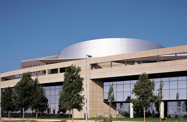 The cylindrical auditorium is enclosed in an aluminum–clad parallel skin surrounded by peripheral cantilevered walkways.