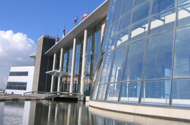 A sloped access square planted with olive trees, showcasing a cascading water feature leads to the main entrance transparent hall.